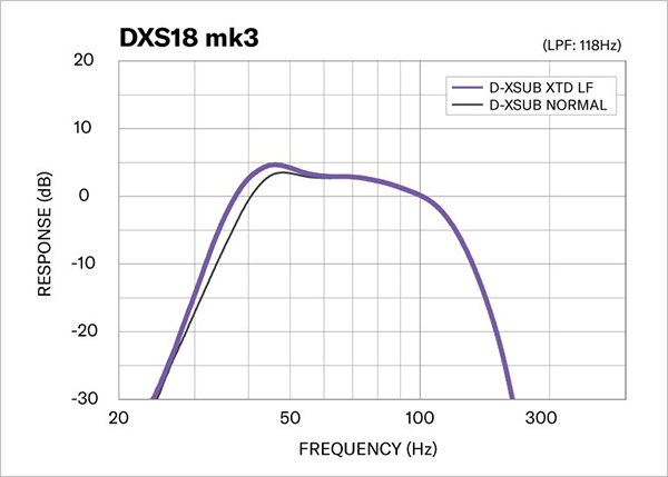 D-XSUB nabízí DSP předvolby, které uživatelům umožňují přizpůsobit subwoofer charakteristiky pro jejich specifickou aplikaci. Režim NORMAL poskytuje doporučené vyvážení basů, zatímco režim XTENDED LF rozšiřuje reprodukční frekvenci pro žánry vyžadující širší akustický rozsah, jako je klasická nebo orchestrální hudba.