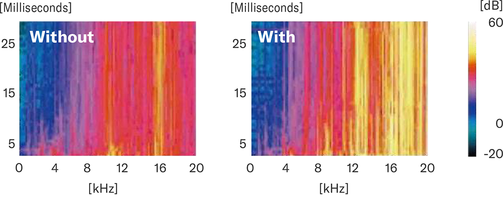 Jasnější barvy na obrázku označují zvýšenou hlasitost a tím i větší rezonance.