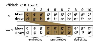 Pro durové tóniny při hraní melodie s nízkými tóny se používá první oktáva (viz obrázek výše). V tomto případě je ohýbání velmi potřebné a ovládání zvuku je obtížné. Pokud se použije nízká tónina, rozsah odpovídá druhé oktávě, je možné hrát se stabilním zvukem. Navíc to přináší možnost vytváření nového výrazu. Díky větší síle zvuku budete fascinováni pocitem chvění vzduchu. Nízká tónina přinese hráčům nové možnosti hraní.