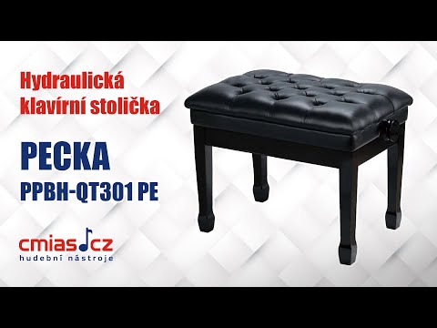 Pecka PPBH-QT301 PE je výškově stavitelná klavírní stolička s hydraulickým nastavením výšky. Rozměry sedáku jsou 67 x 35,5 cm a stoličku lze nastavit na výšku v rozmezí 45-61 cm (výška sedáku od země). Stolička má klasickou konstrukci se čtyřmi nohami a pohodlný sedák s černým koženkovým potah.